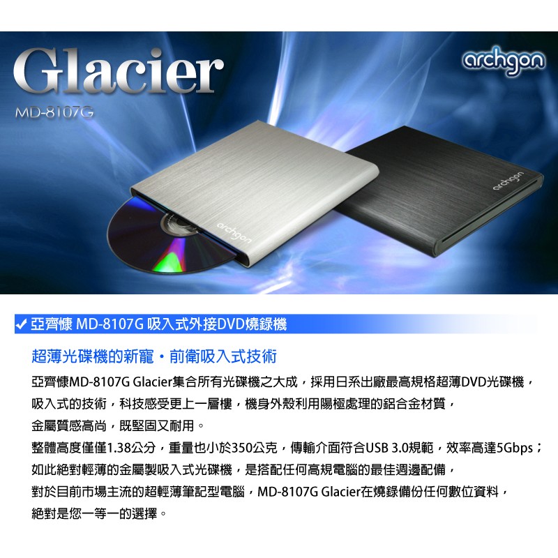 archgon 超薄8X USB 3.0吸入式DVD燒錄機 MD-8107G-U3