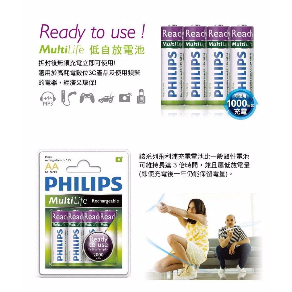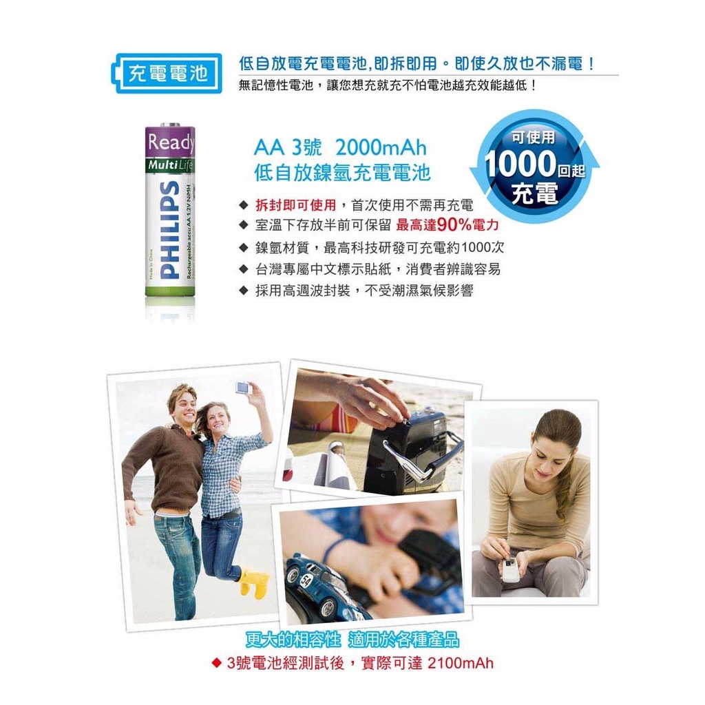 PHILIPS 飛利浦 AA 3號 2000mAh 低自放鎳氫充電電池(4入)